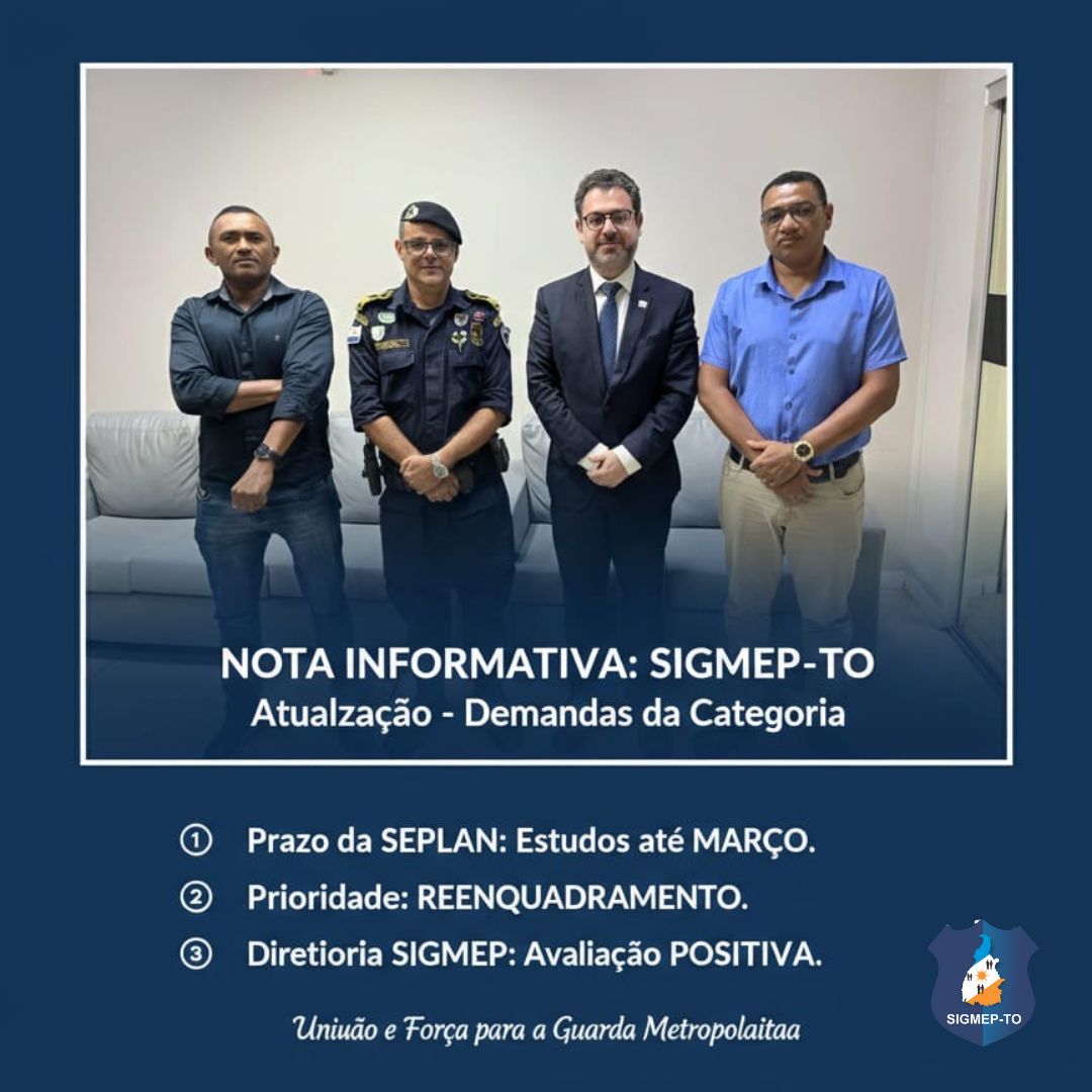 O Sindicato dos Guardas Metropolitanos do Tocantins (SIGMEP) divulgou nota informativa nesta quinta-feira (12) para atualizar a categoria sobre as tratativas junto à Prefeitura de Palmas. A diretoria do sindicato se reuniu, na tarde de hoje, com o secretário municipal de Planejamento, André Fagundes, na sede da pasta.
